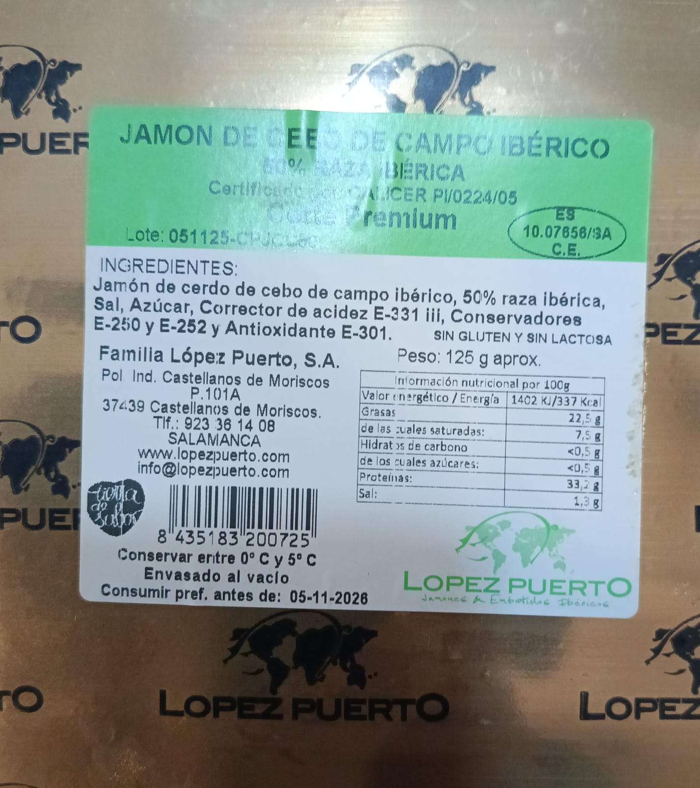 🥩 Jamón de Cebo de Campo 50% Ibérico (López Puerto) – Envasado al Vacío 125gr