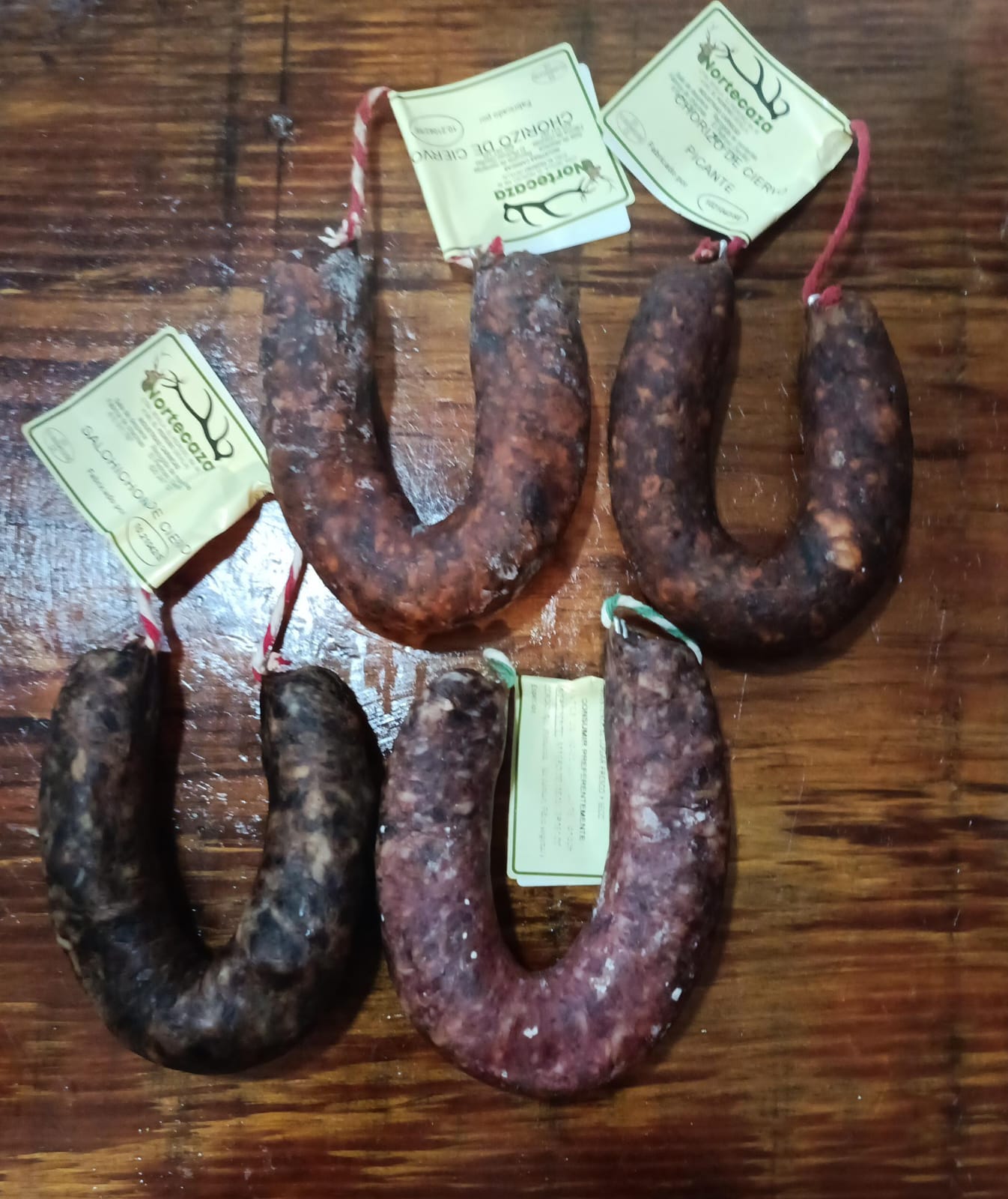 1x Chorizo de Ciervo (aprox. 0,250 kg): Un chorizo de caza tradicional, con el pimentón justo para realzar la carne magra del ciervo.